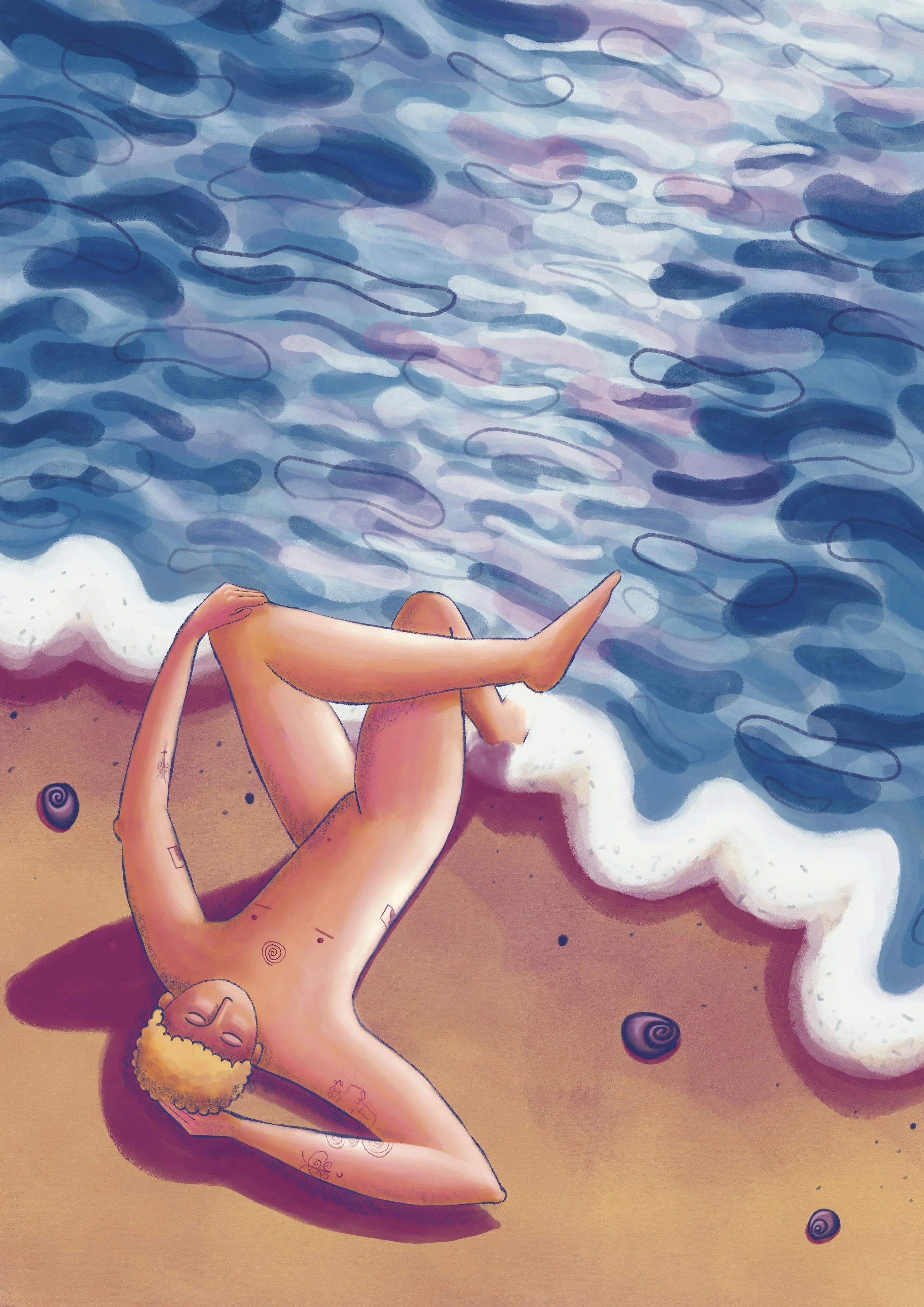 Non binary person is laying down naked by the sea on the beach.