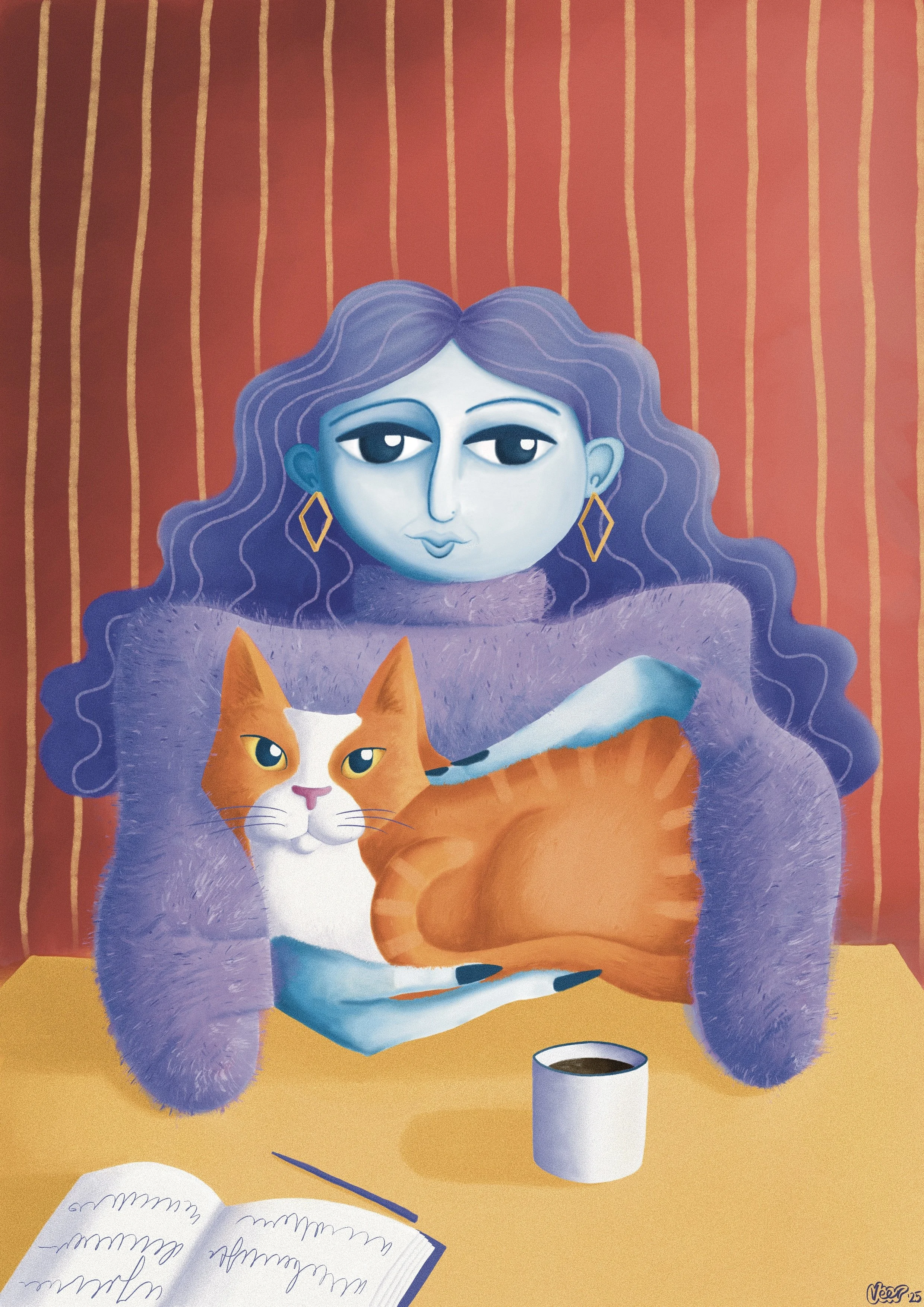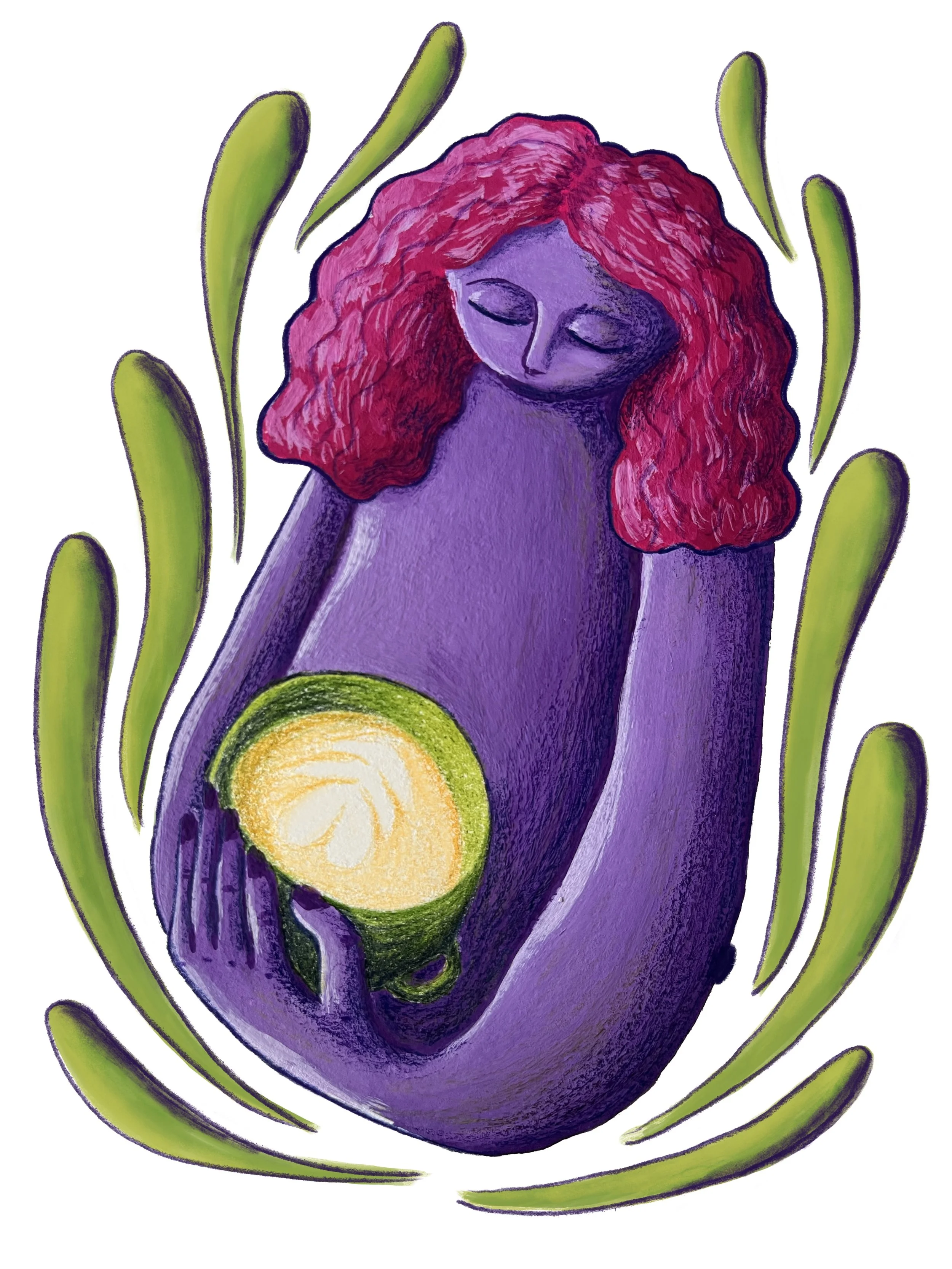 A stylized painting of a purple woman with red, curly hair holding a cup of coffee, surrounded by green leaves.
