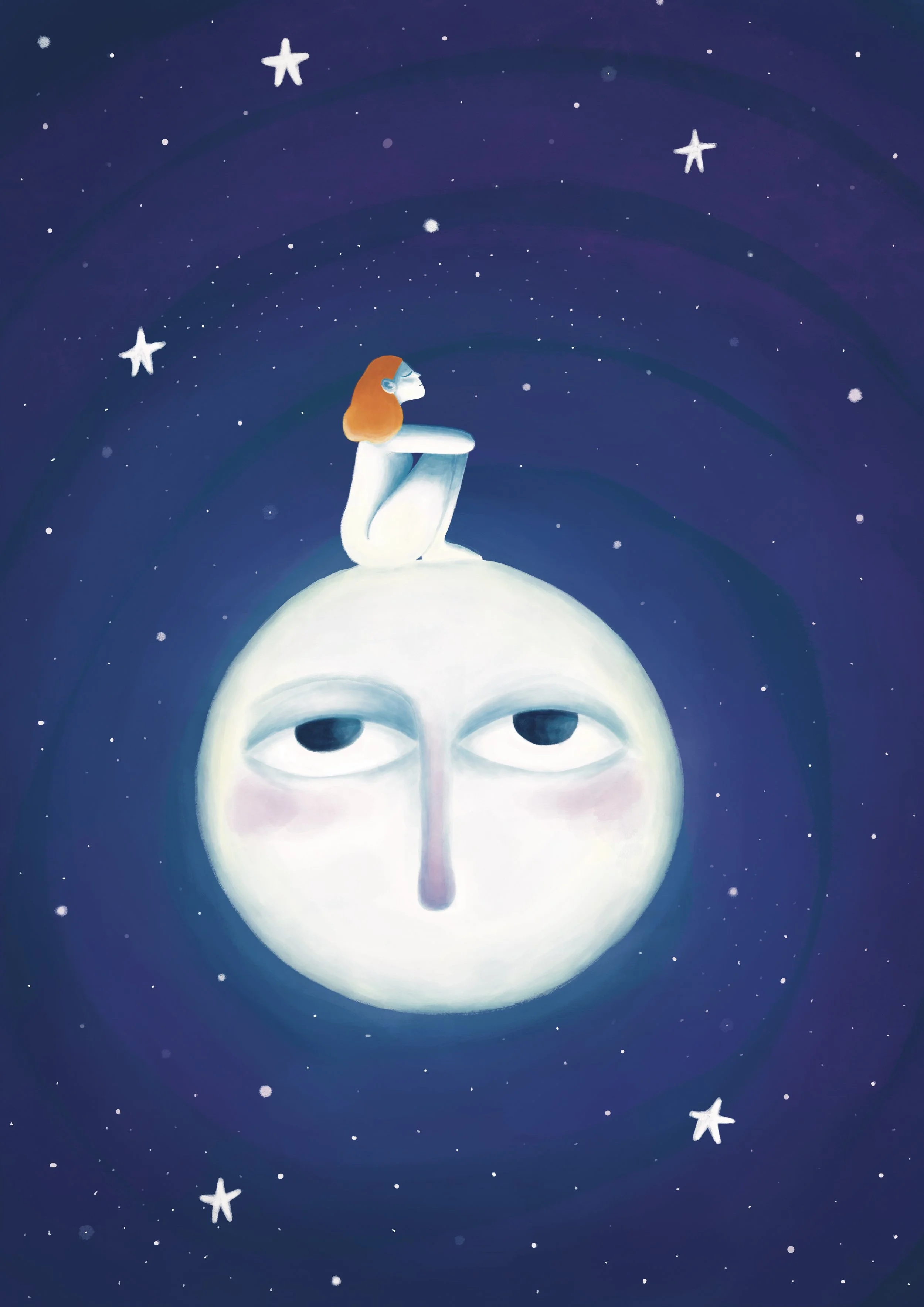 White girl with orange hair is sitting on the moon. The moon has eyes and a nose.