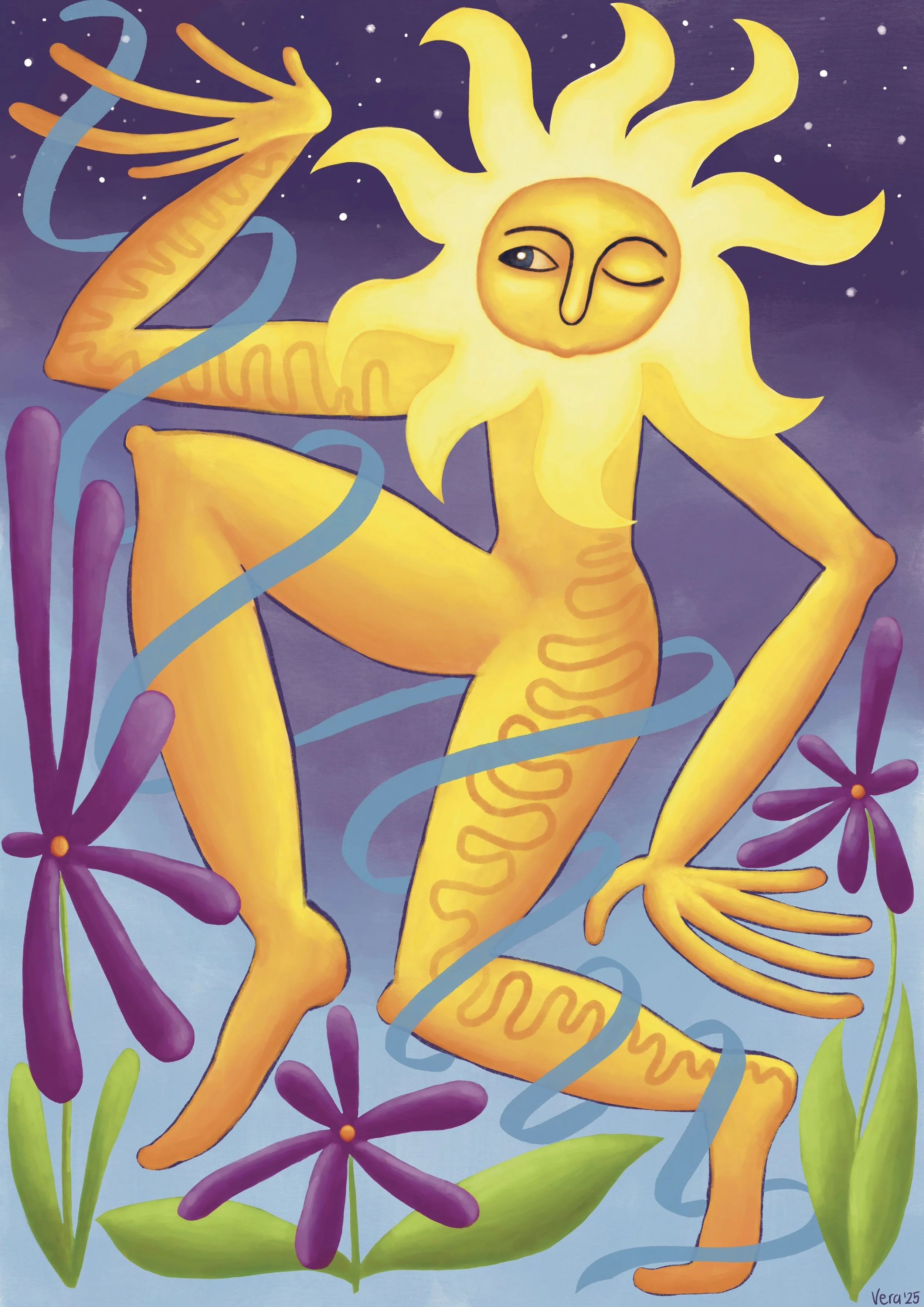 A sun figure with a body is dancing surrounded by purple flowers in the night sky. There's a blue ribbon