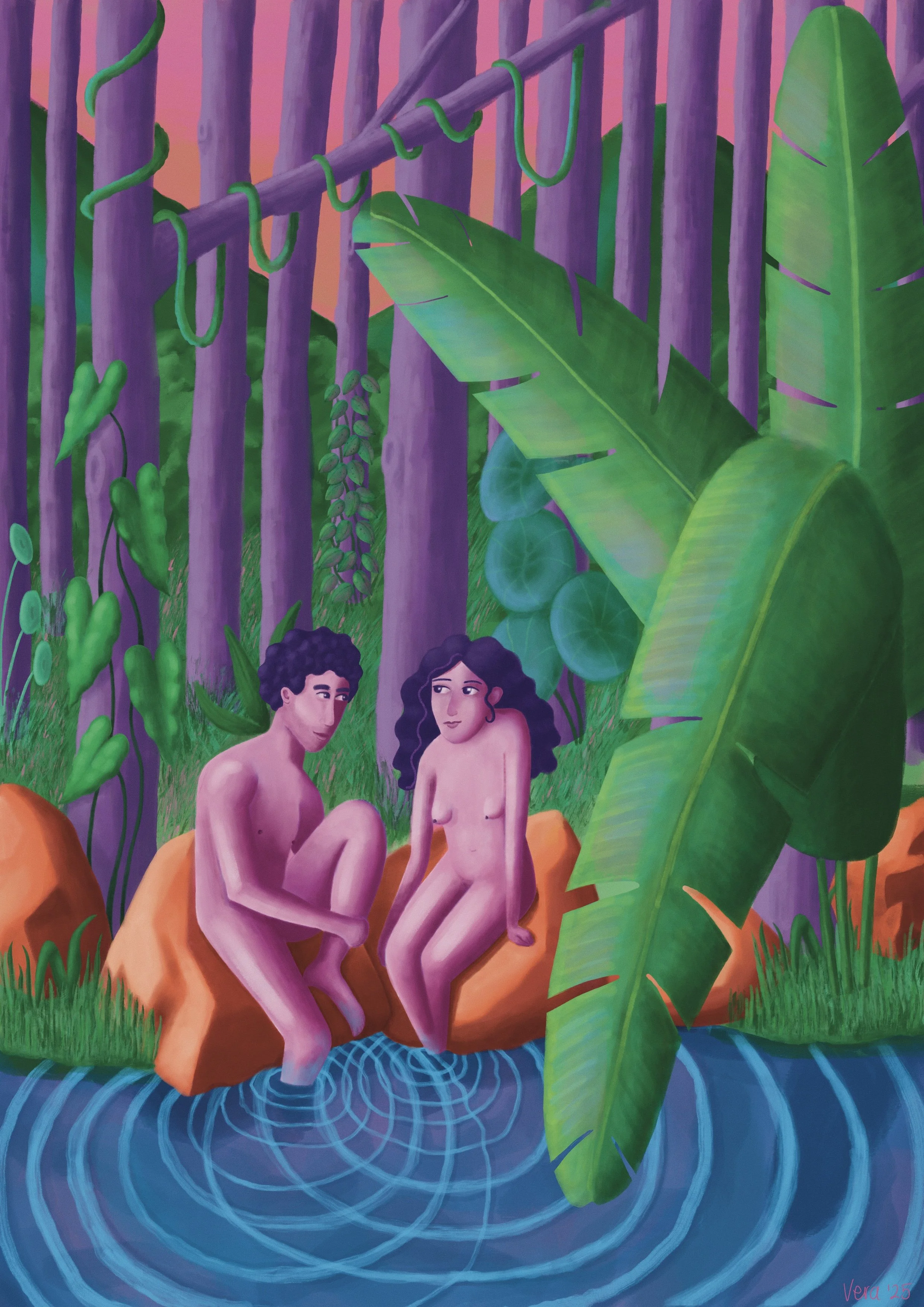 Two pink people sitting on rocks by the water in a colorful forest. They look at each other.