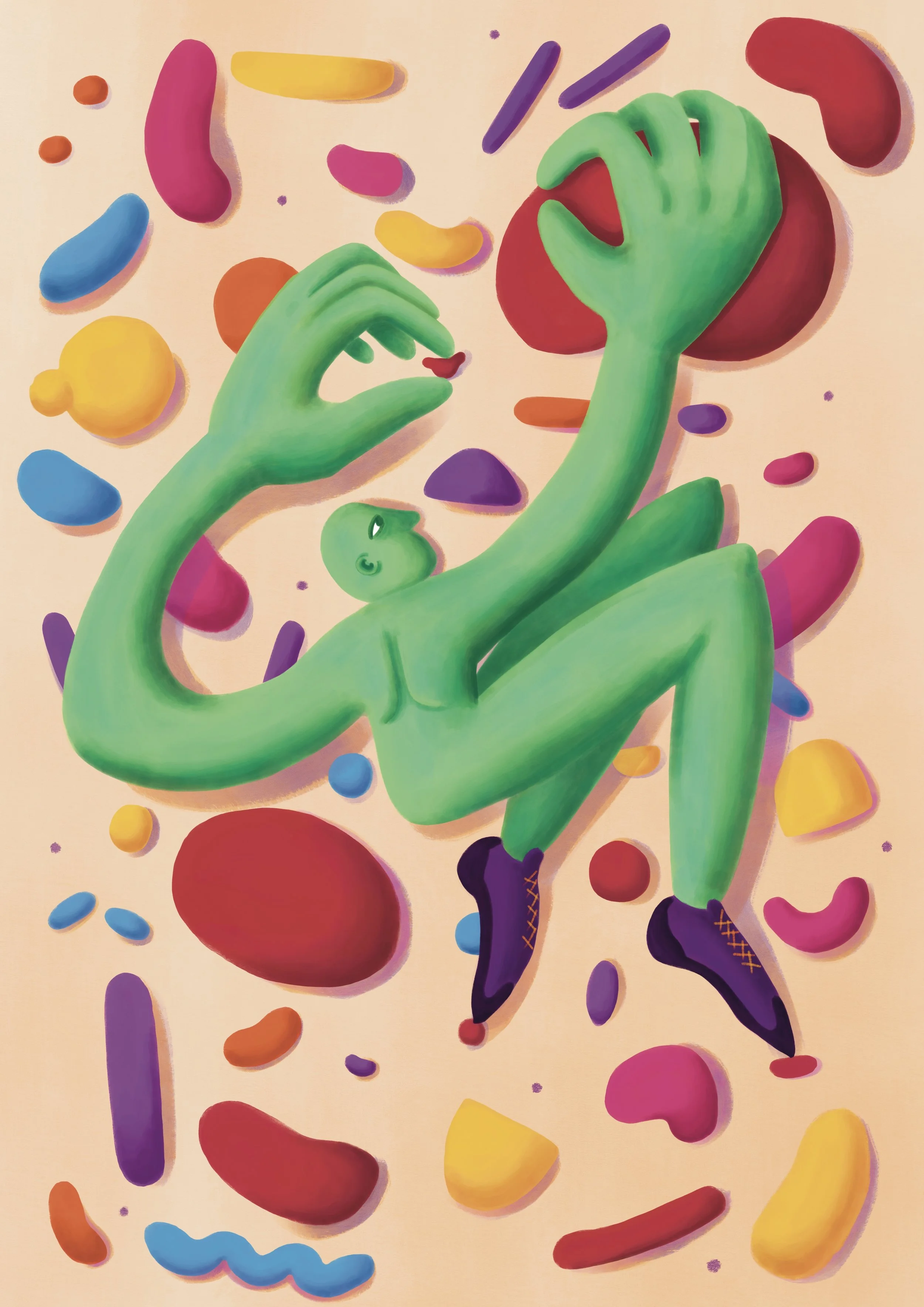 A green person with big arms and legs is climbing a yellow wall with colored boulders