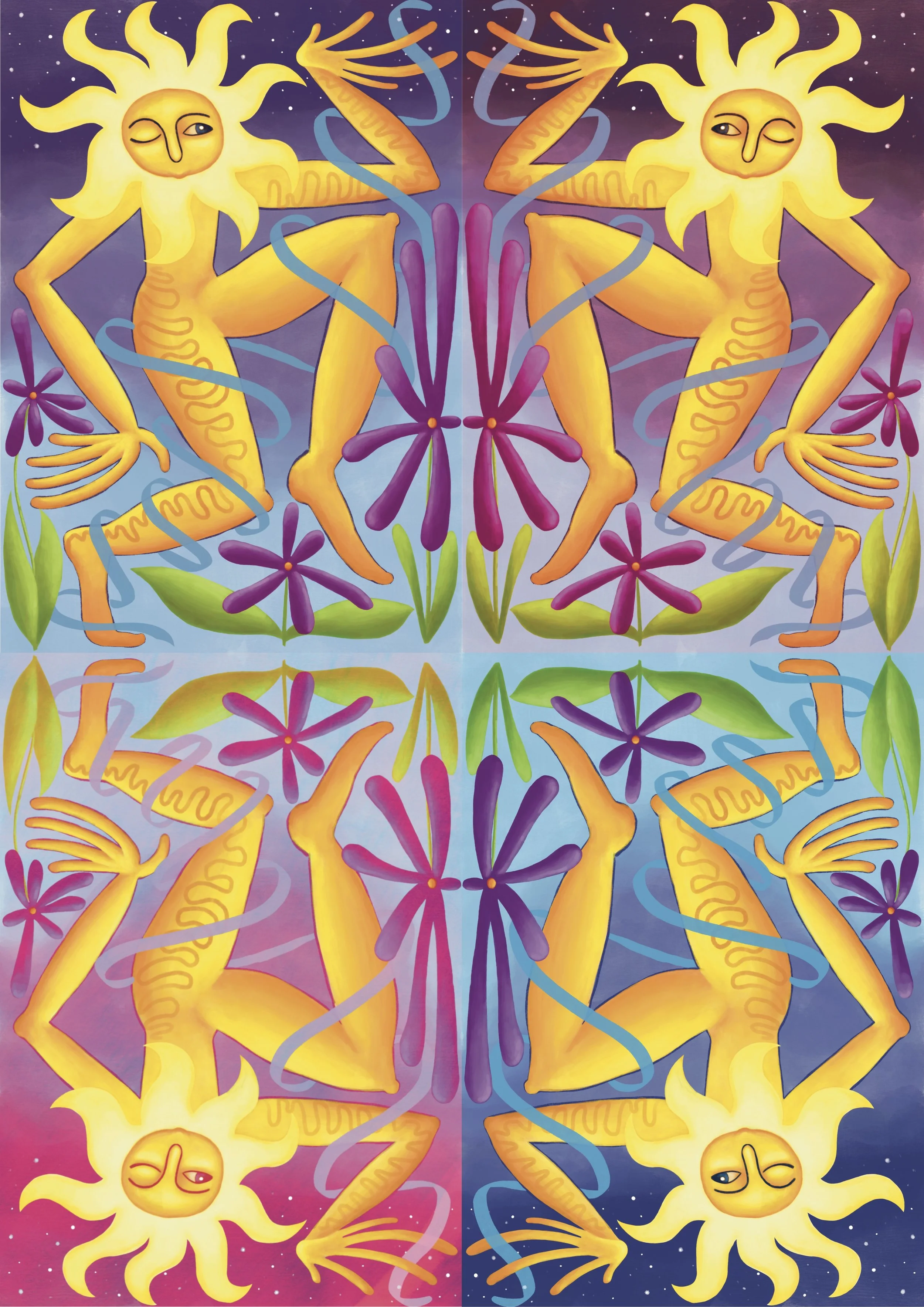 A symmetrical, colorful painting featuring four yellow, humanoid sun figures with smiling, winking sun faces, surrounded by purple flowers and green leaves, set against a starry night sky background.