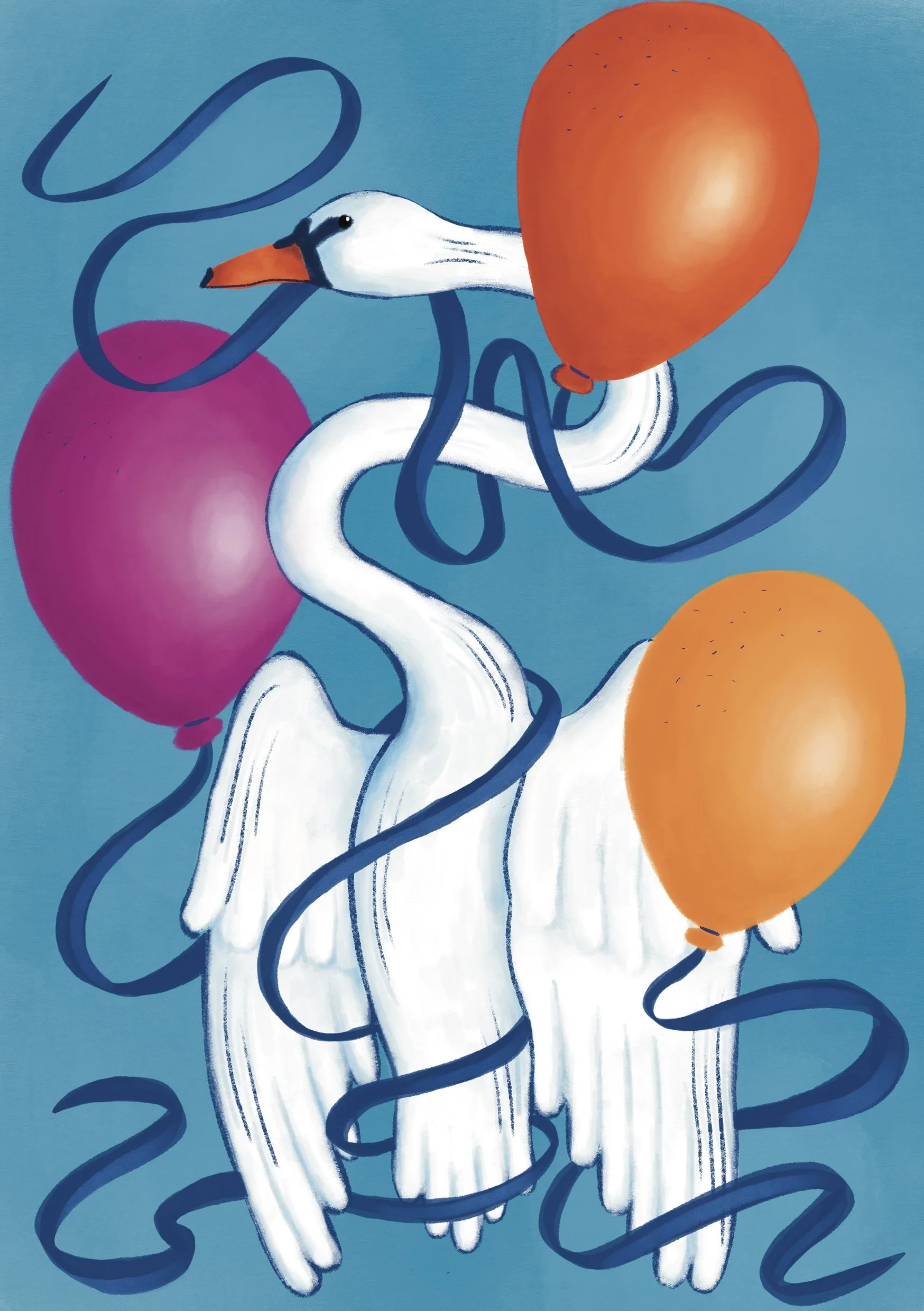 White swan surrounded with orange, pink and yellow balloons and a blue ribbon.