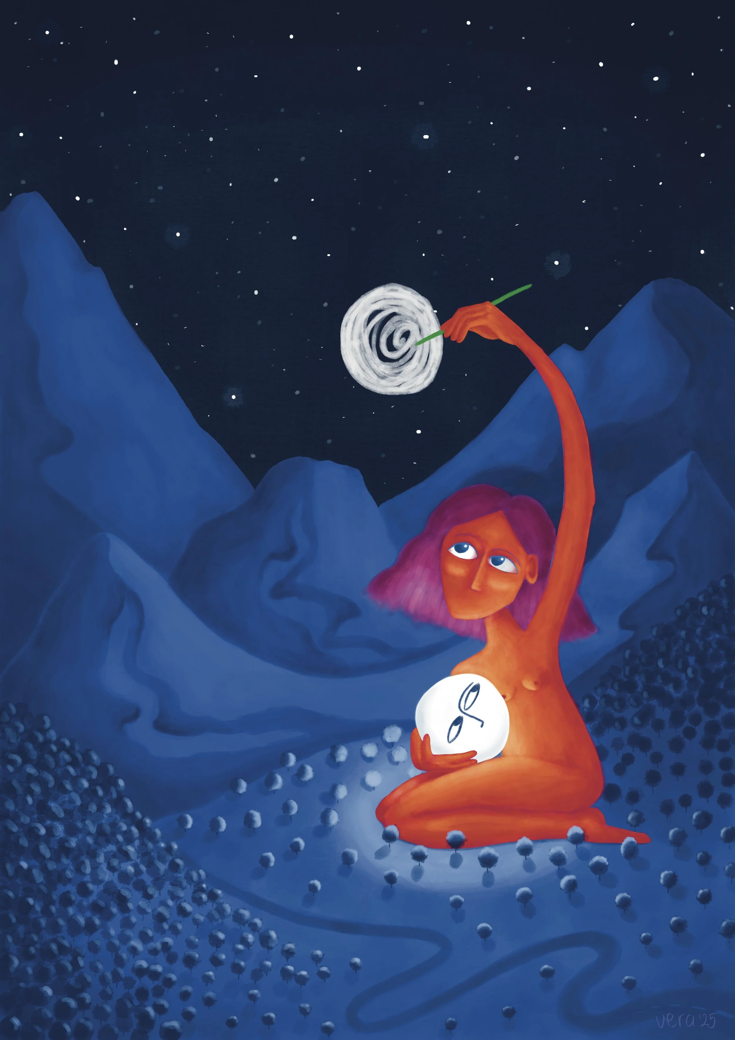 Red girl is sitting in the mountains and holds the moon, while she draws a moon in the night sky with a pencil