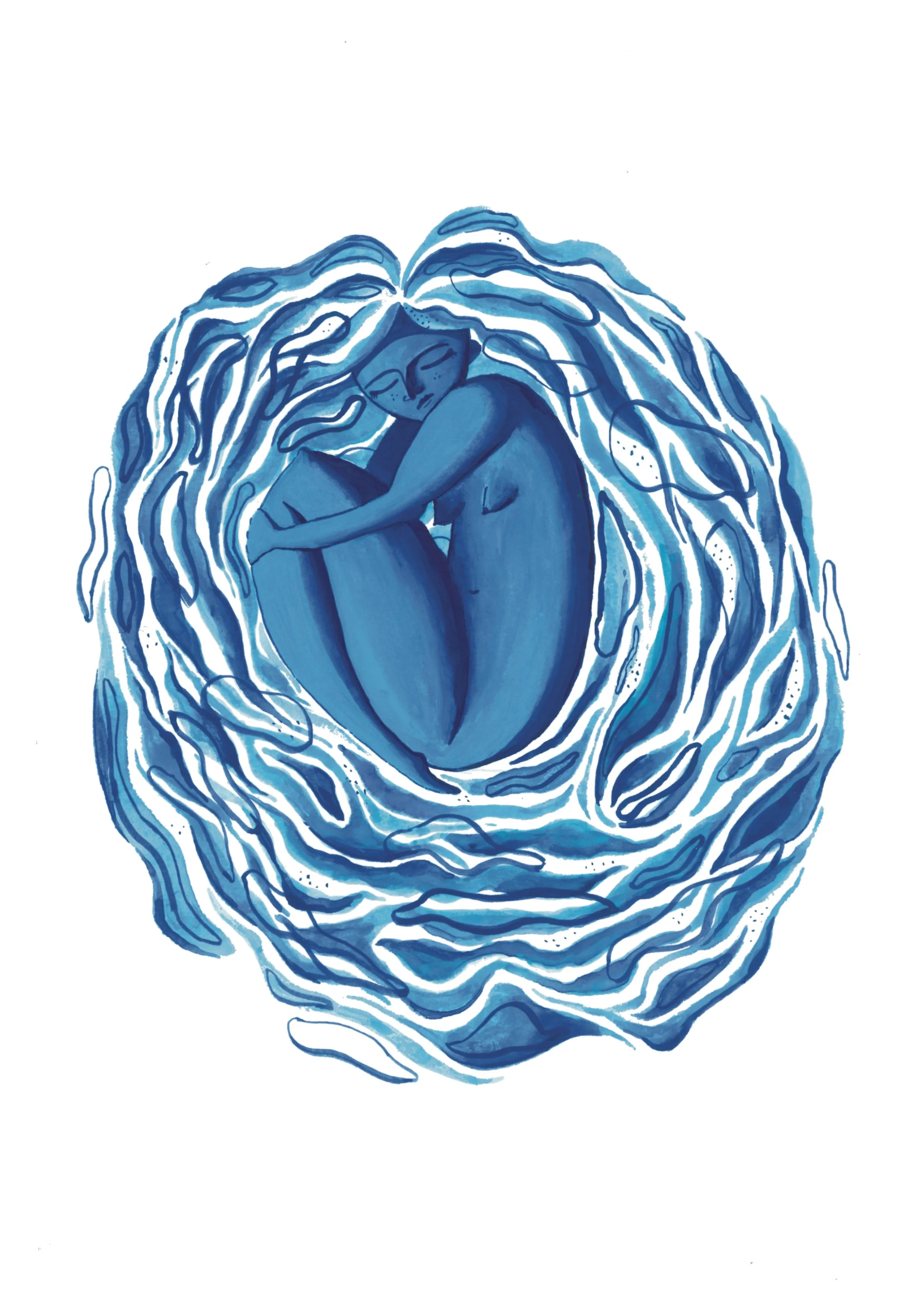 Blue-toned illustration of a woman curled up, surrounded by swirling lines resembling water or waves.