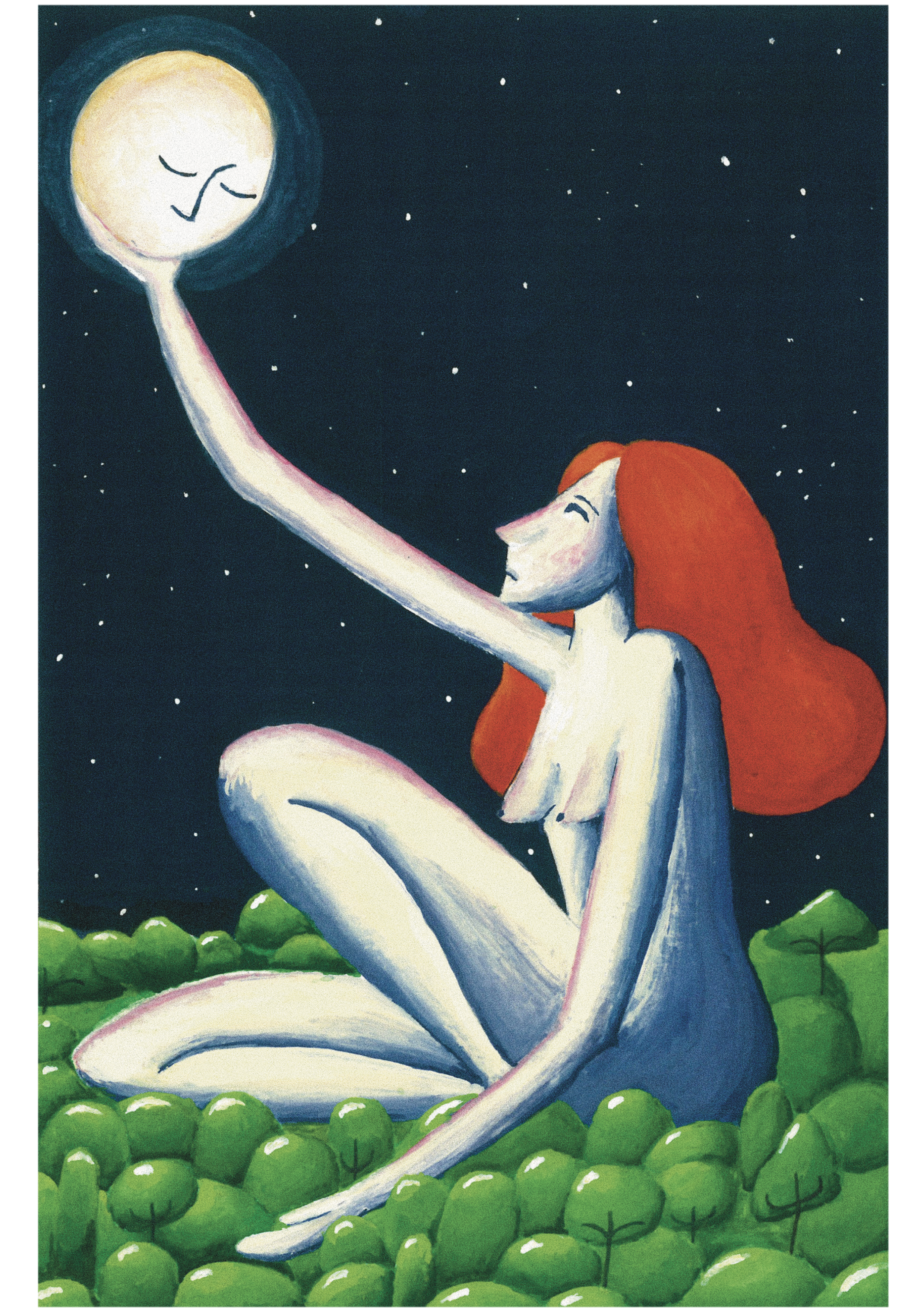 Naked woman with red hear sitting in the forest and holding the moon.
